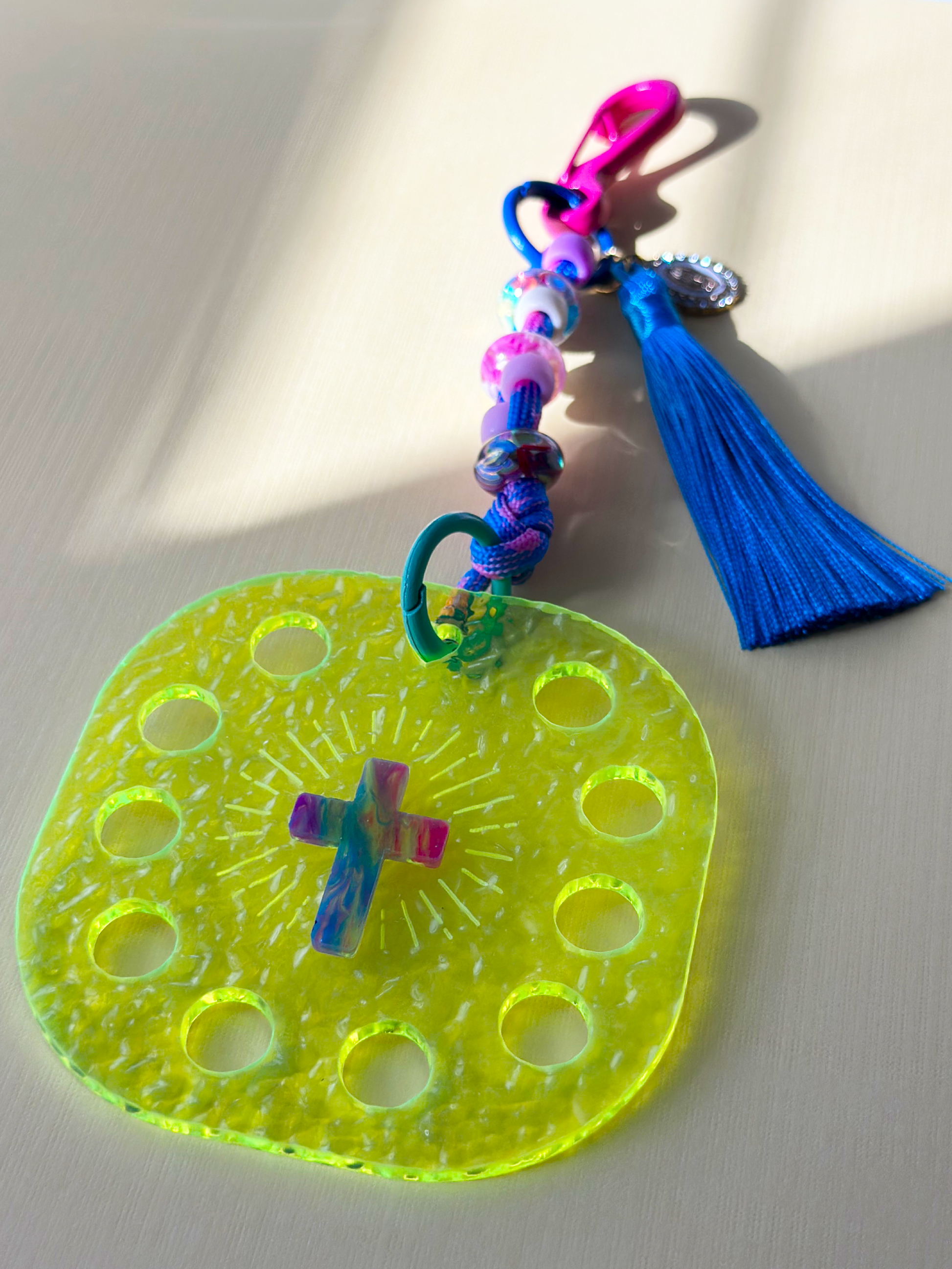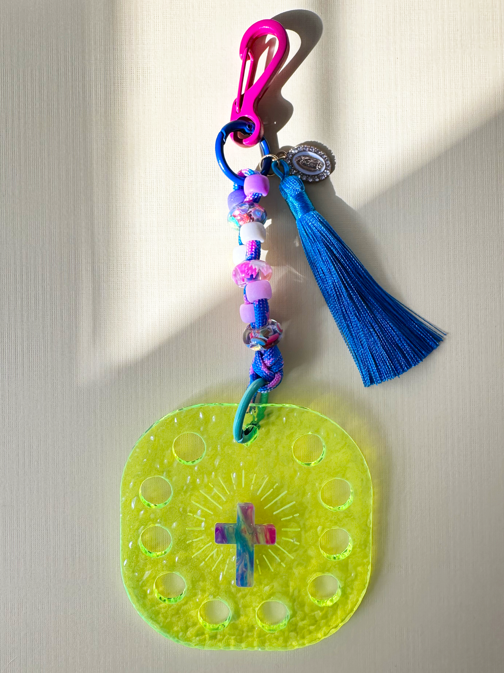 The Holy Charm neon green is more than just a colorful accessory; it is a functional prayer tool. Its striking neon finish and multi-colored accents make it a standout piece for any bag or keyring, serving as a bright reminder of joy and devotion.