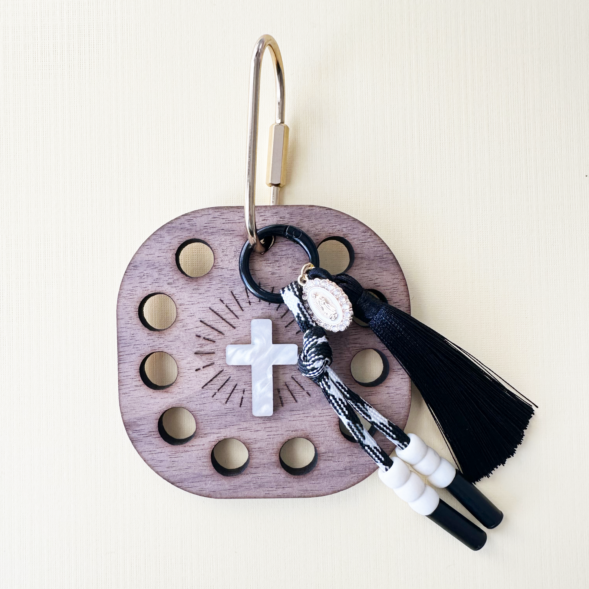 The Holy Charm Wood is more than just an accessory; it is a functional prayer tool. Its warm wood finish and contrasting black and white accents make it a versatile statement piece that complements any bag or keyring while serving as a constant reminder of peace and protection.